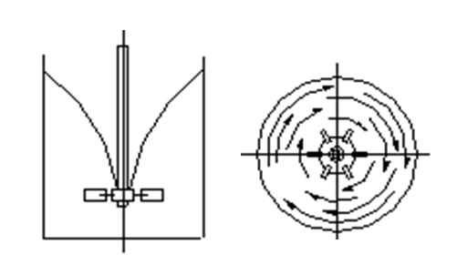 流體流動方向平行于攪拌軸,流體由槳葉推動,使流體向下流動,遇到容器底面再向上翻,形成上下循環流。